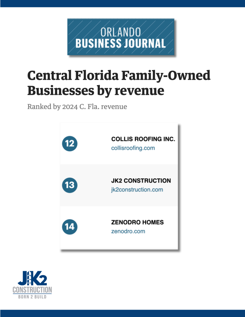 JK2 Construction is proud to be named to the Orlando Business Journal’s list of Central Florida Family-Owned Businesses.